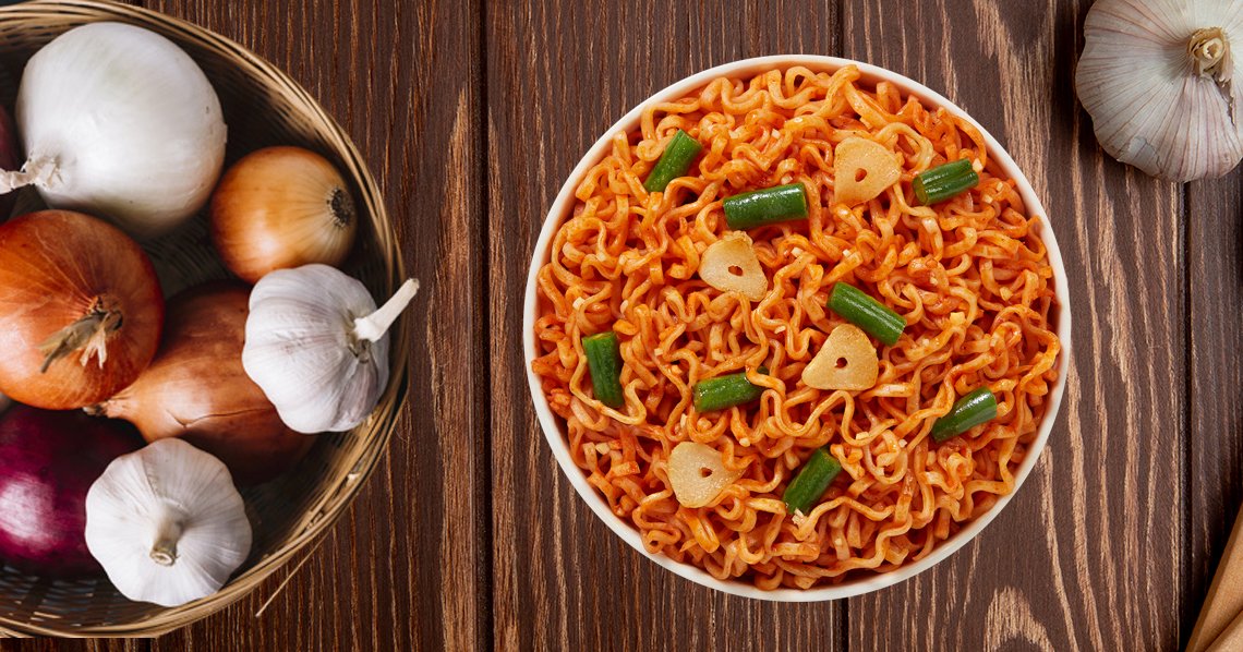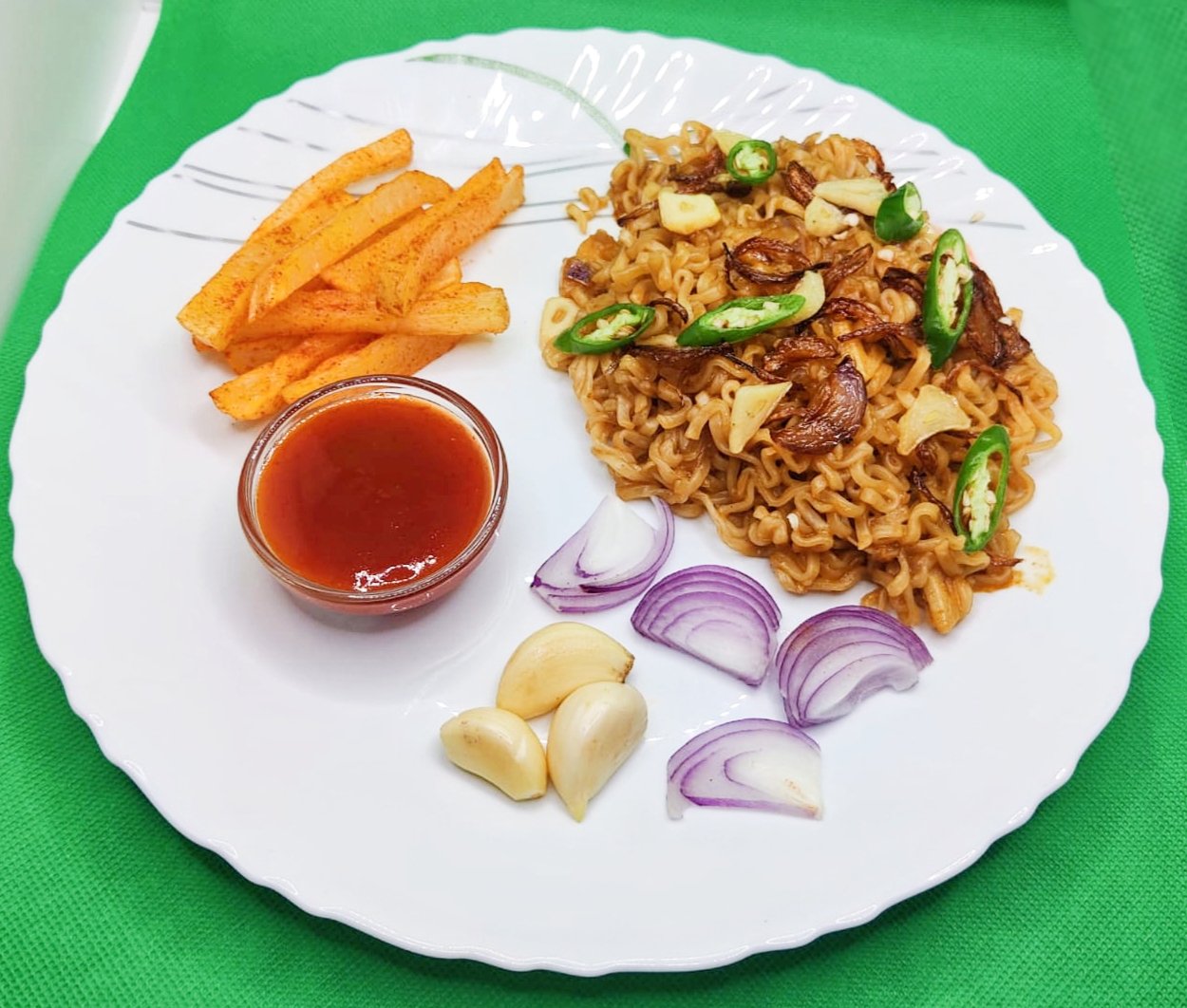 Mix well-fried onion, garlic, and noodle on a medium flame for a few minutes.