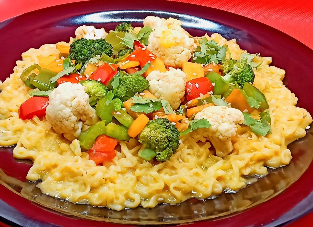 Meanwhile, heat the cooking oil in a frying pan over medium heat, add the Green, Red Bell pepper, Carrot and boiled Cauliflower and Broccoli, and stir fry for 2 minutes. Add ground ginger, garlic paste, Soya sauce, Red chilli and Tomato sauce, salt to taste and fry for another minute.